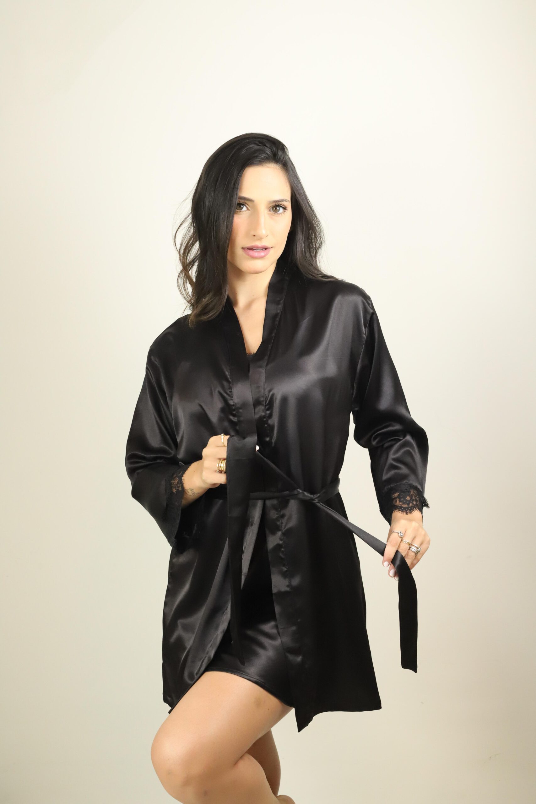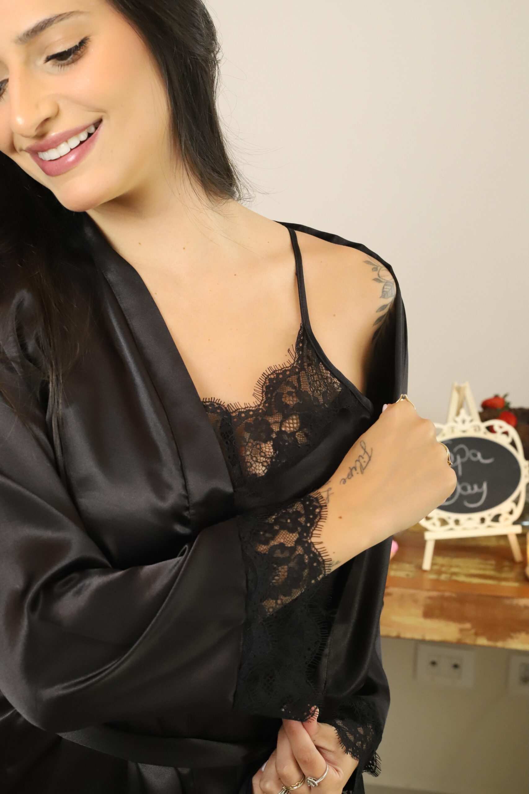 Ideal para usar sobre camisolas ou conjuntos de dormir, o Amarillys – Robe Preto Acetinado com Renda eleva qualquer produção de descanso a um novo nível de elegância.