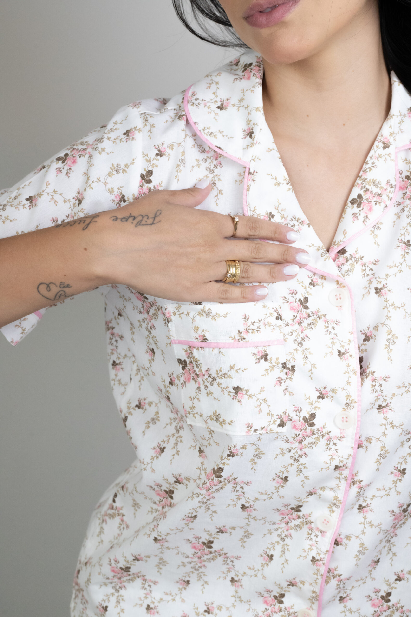 O Pijama Flor-de-Cerejeira celebra a delicadeza dos pequenos detalhes. Seu fundo branco com estampa floral em tons rosados remete ao florescer suave das cerejeiras, traduzindo leveza, romantismo e feminilidade em cada traço.