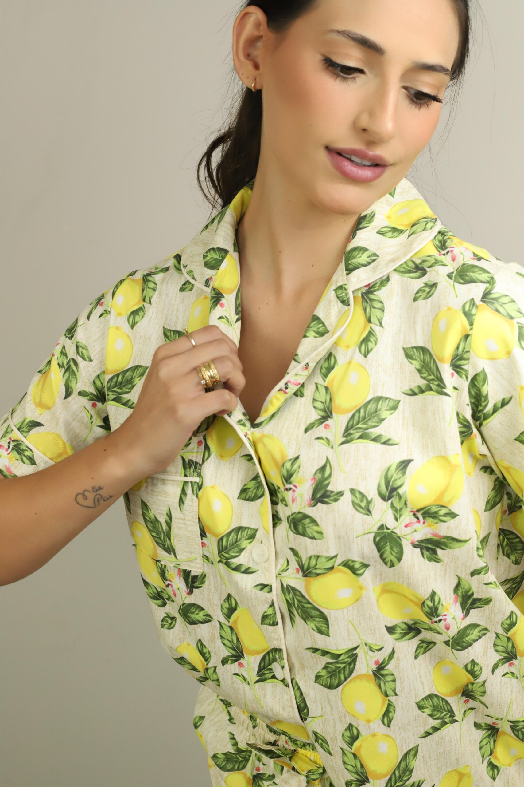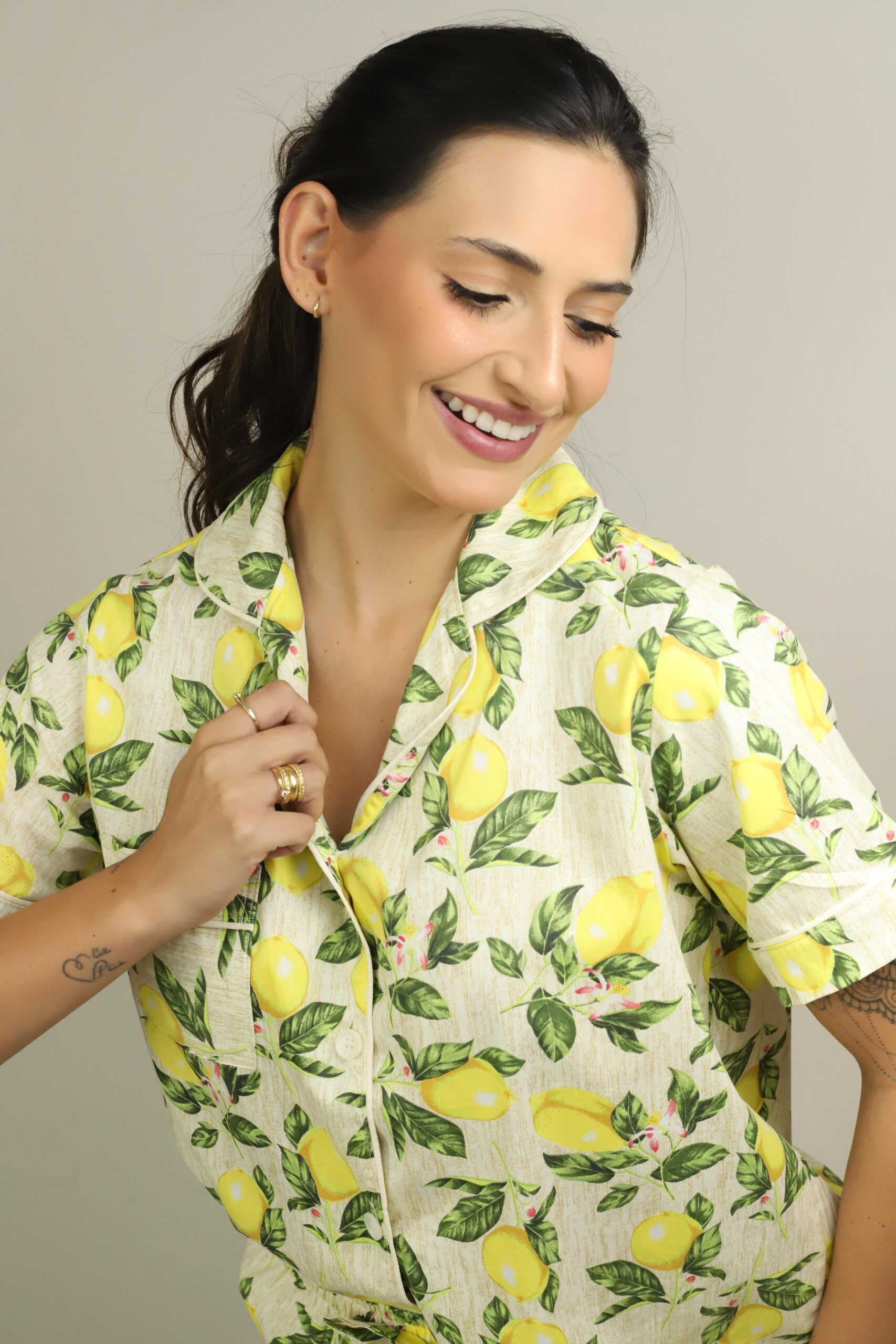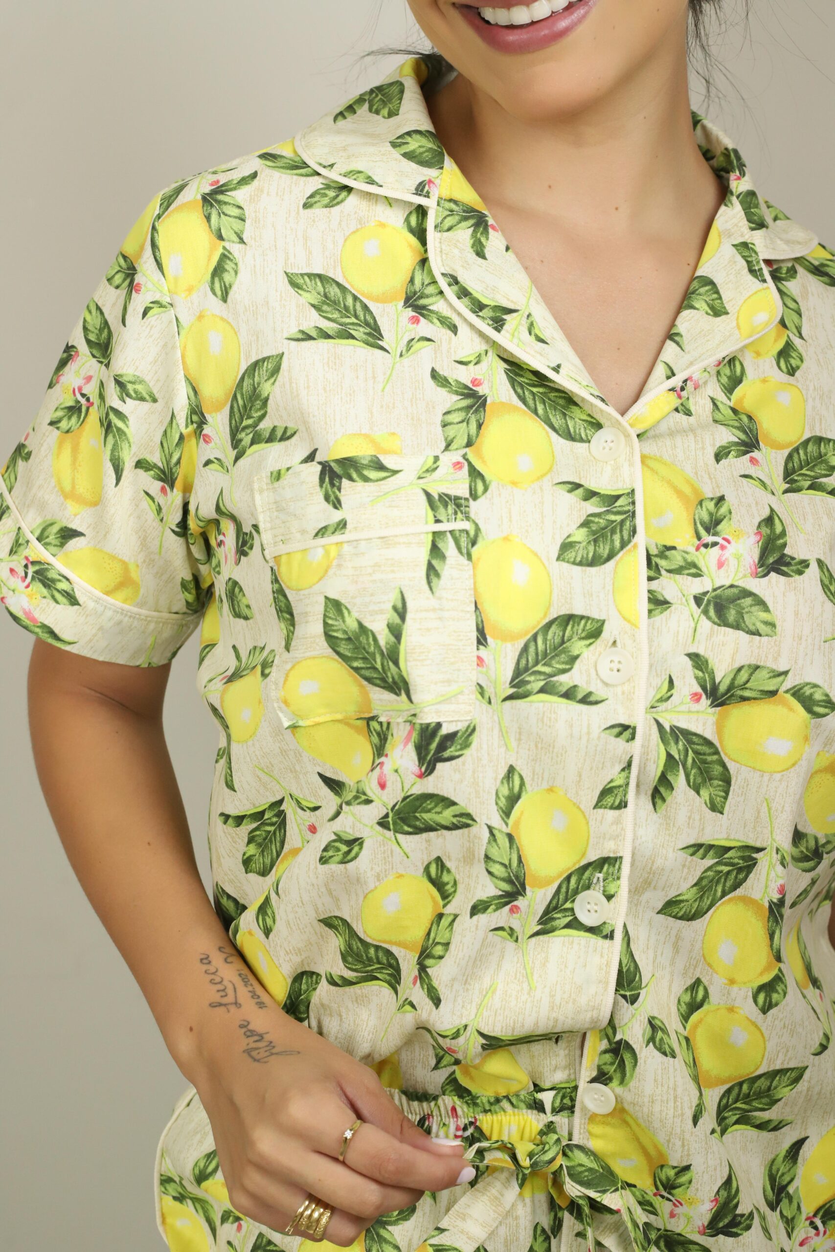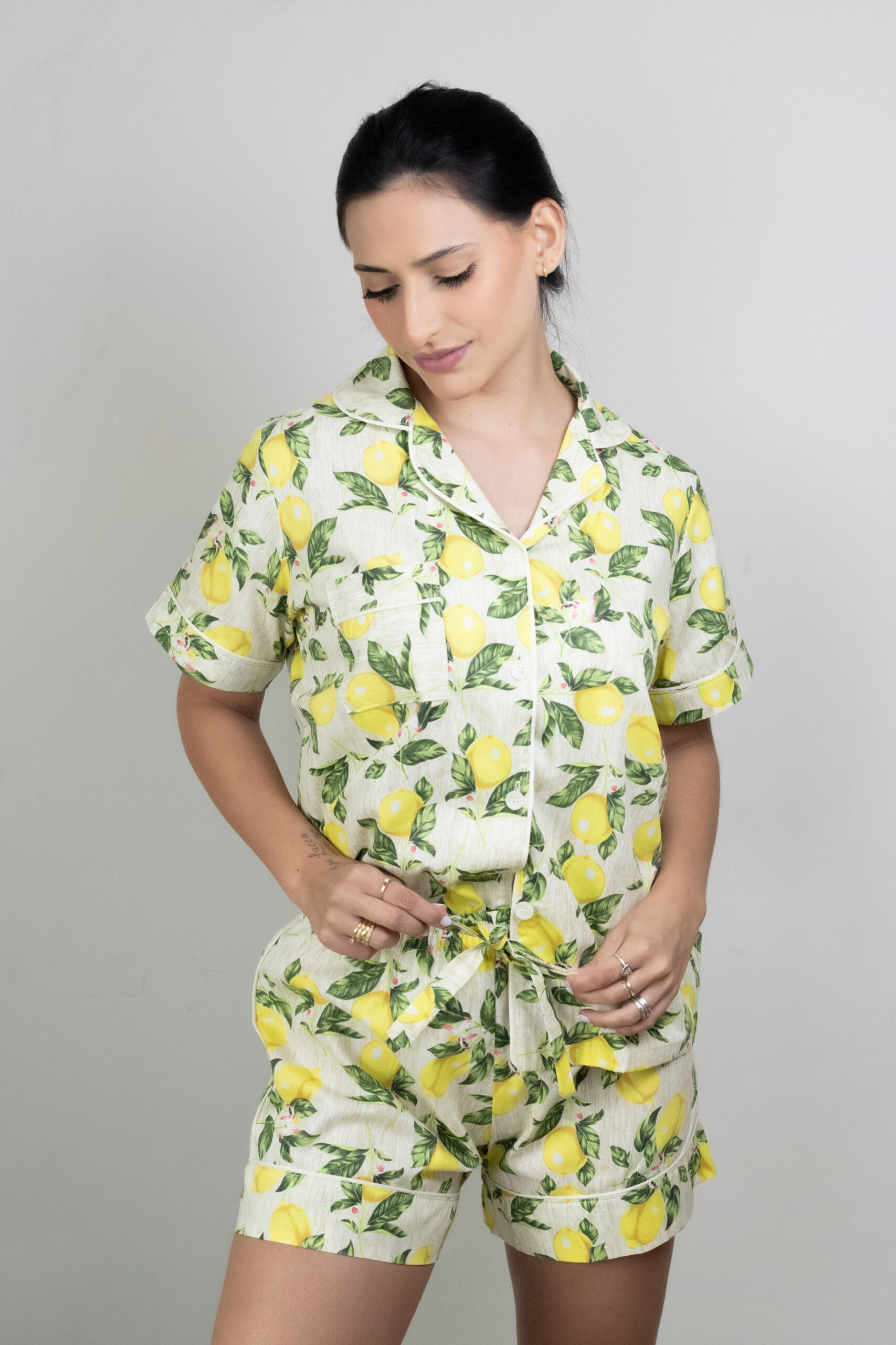 O Pijama Flor de Limão é a escolha perfeita para quem ama peças cheias de vida e frescor. Com uma estampa alegre de limões sicilianos, ele traz uma sensação imediata de leveza, bem-estar e descontração.