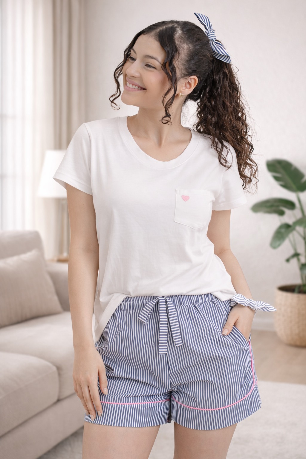 O short em tric fio tinto listrado marinho com frisos rosa oferece leveza e conforto, enquanto o laço ajustável na cintura garante um caimento perfeito. A camiseta em malha de algodão com elastano, na cor branca, proporciona toque macio e liberdade de movimentos. O charme fica por conta do cobre-gola listrado e do bordado de coração rosa no bolso, que adicionam um toque romântico à peça.